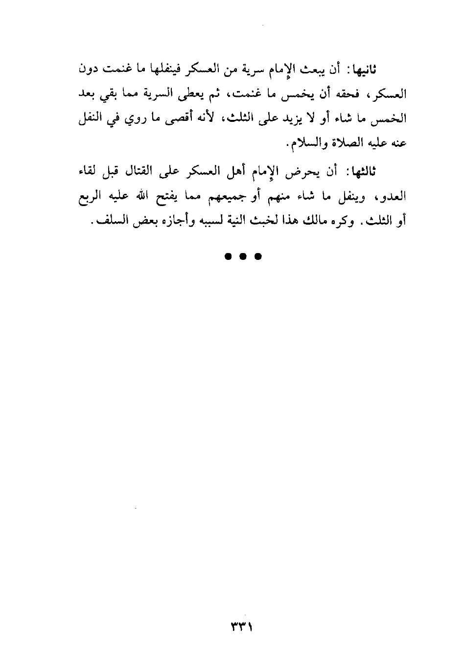ثالثها: أن يحرض الإِمام أهل العسكر على القتال قبل لقاء العدو، وينفل ما شاء منهم أو جميعهم مما يفتح الله عليه الربع أو الثلث. وكره مالك هذا لخبث النية لسببه وأجازه بعض السلف.