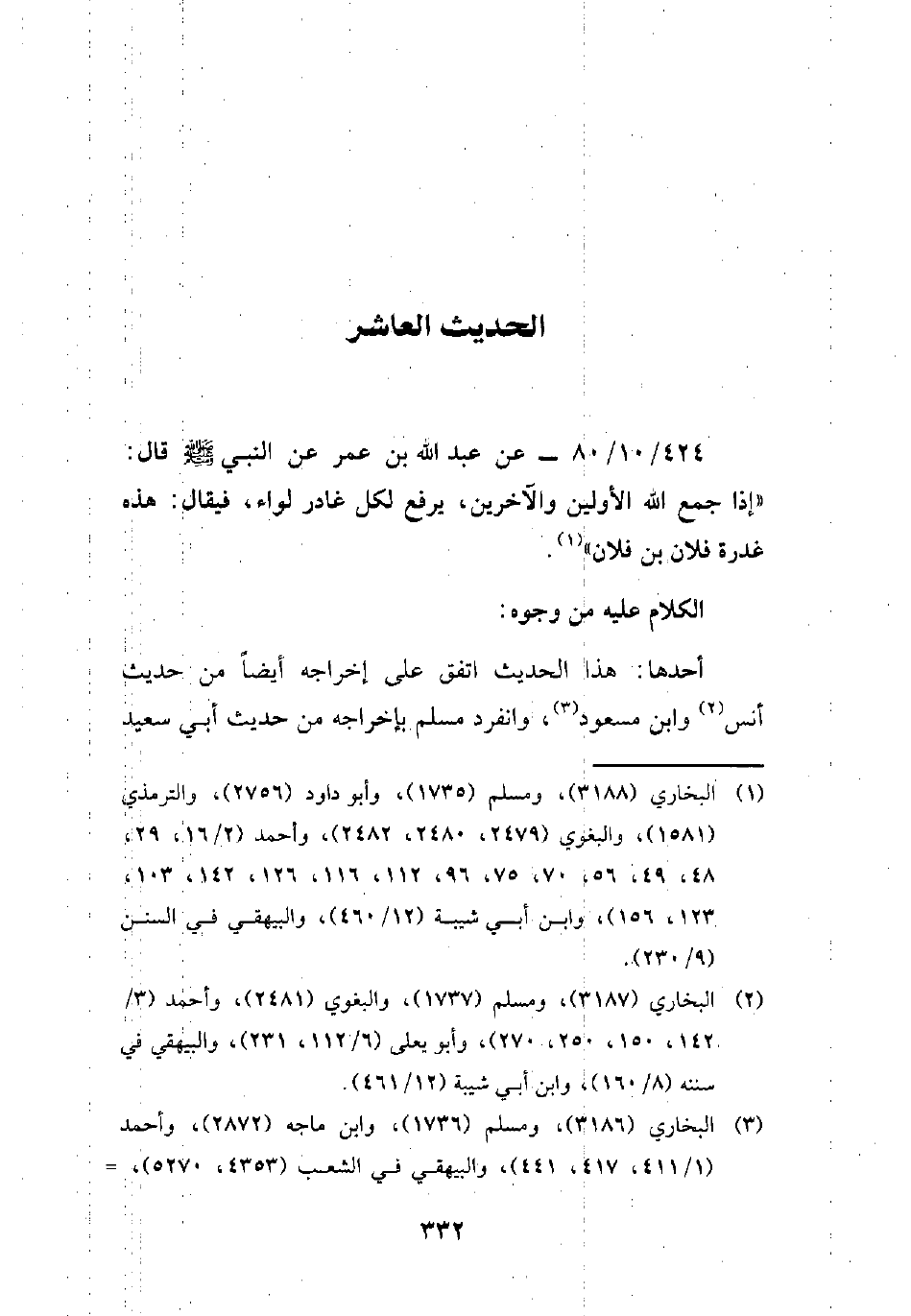 424/ 10/ 80 - عن عبد الله بن عمر عن النبي - صلي الله عليه وسلم - قال: "إذا جمع الله الأولين والآخرين، يرفع لكل غادر لواء، فيقال: هذه غدرة فلان بن فلان" (¬1).