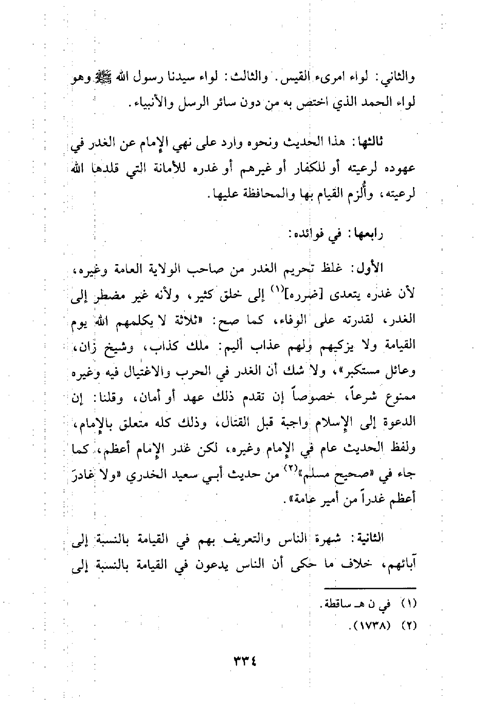 ثالثها: هذا الحديث ونحوه وارد على نهي الإِمام عن الغدر في عهوده لرعيته أو للكفار أو غيرهم أو غدره للأمانة التي قلدها الله لرعيته، وأُلزم القيام بها والمحافظة عليها.