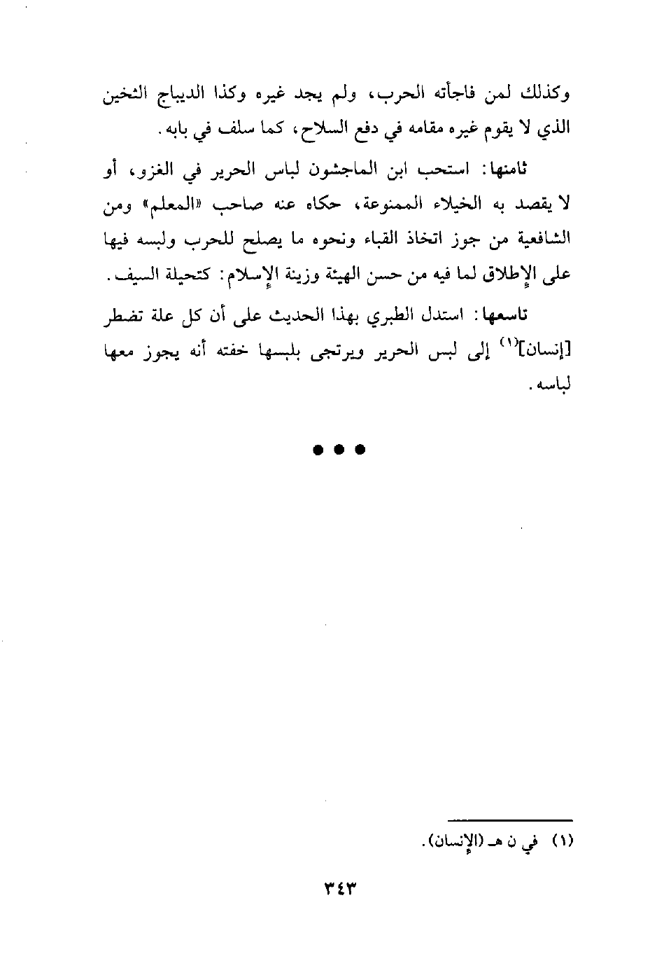 ثامنها: استحب ابن الماجشون لباس الحرير في الغزو، أو لا يقصد به الخيلاء الممنوعة، حكاه عنه صاحب "المعلم" ومن الشافعية من جوز اتخاذ القباء ونحوه ما يصلح للحرب ولبسه فيها على الإِطلاق لما فيه من حسن الهيئة وزينة الإِسلام: كتحيلة السيف.