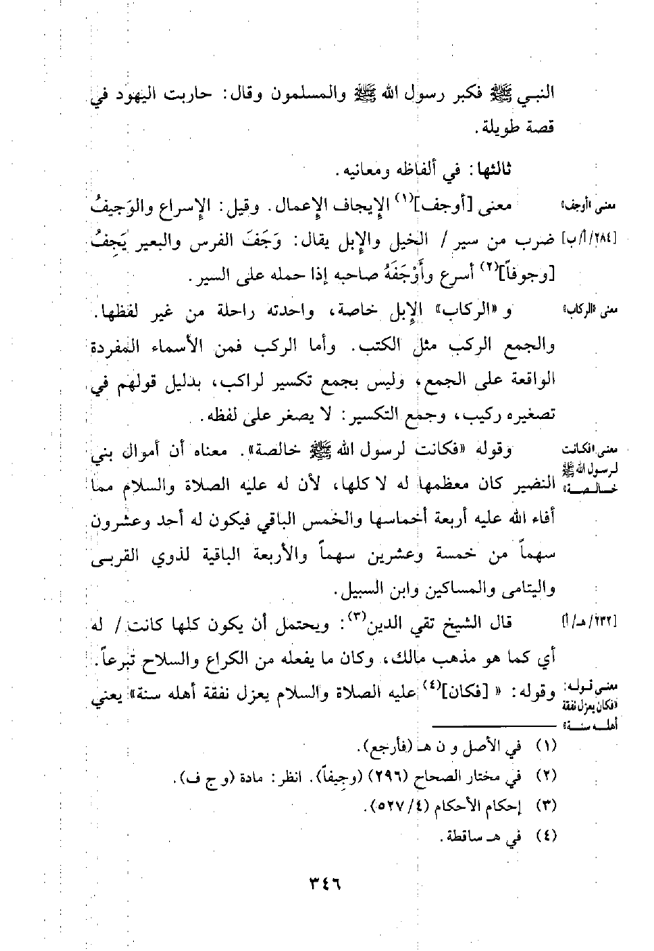 وقوله "فكانت لرسول الله - صلي الله عليه وسلم - خالصة". معناه أن أموال بني النضير كان معظمها له لا كلها, لأن له عليه الصلاة والسلام مما أفاء الله عليه أربعة أخماسها والخمس الباقي فيكون له أحد وعشرون سهمًا من خمسة وعشرين سهمًا والأربعة الباقية لذوي القربى واليتامى والمساكين وابن السبيل.