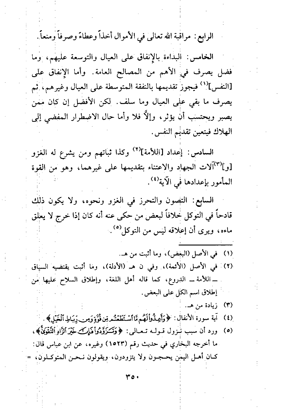 الخامس: البداءة بالإِنفاق على العيال والتوسعة عليهم، وما فضل يصرف في الأهم من المصالح العامة. وأما الإِنفاق على [النفس] (¬1) فيجوز تقديمها بالنفقة المتوسطة على العيال وغيرهم، ثم يصرف ما بقي على العيال وما سلف. لكن الأفضل إن كان ممن يصبر ويحتسب أن يؤثر، وإلاَّ فلا وأما حال الاضطرار المفضي إلى الهلاك فيتعين تقديم النفس.
