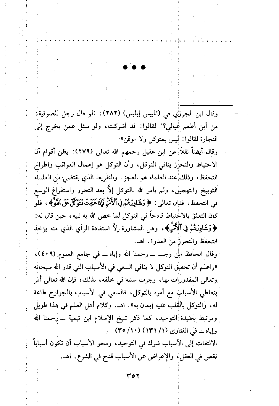 وقال أيضًا نقلًا عن ابن عقيل رحمهم الله تعالى (279): يظن أقوام أن الاحتياط والتحرز ينافي التوكل، وأن التوكل هو إهمال العواقب واطراح التحفظ، وذلك عند العلماء هو العجز. والتفريط الذي يقتضي من العلماء التوبيخ والتهجين، ولم يأمر الله بالتوكل إلَّا بعد التحرز واستفراغ الوسع في التحفظ، فقال تعالى: {وَشَاوِرْهُمْ في الْأَمْرِ فَإِذَا عَزَمْتَ فَتَوَكَّلْ عَلَى اللهِ} , فلو كان التعلق بالاحتياط قادحًا في التوكل لما خص الله به نبيه، حين قال له: {وَشَاوِرْهُمْ في الْأَمْرِ}، وهل المشاورة إلَّا استفادة الرأي الذي منه يؤخذ التحفظ والتحرز من العدو". اهـ.