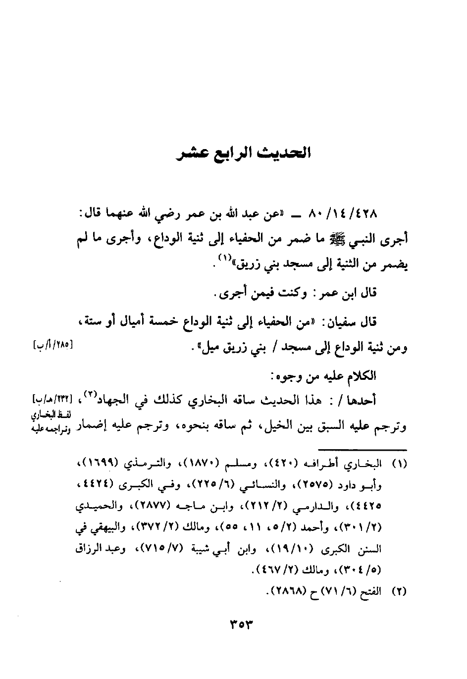 428/ 14/ 80 - " عن عبد الله بن عمر رضي الله عنهما قال: أجرى النبي - صلي الله عليه وسلم - ما ضمر من الحفياء إلى ثنية الوداع، وأجرى ما لم يضمر من الثنية إلى مسجد بني زريق" (¬1).