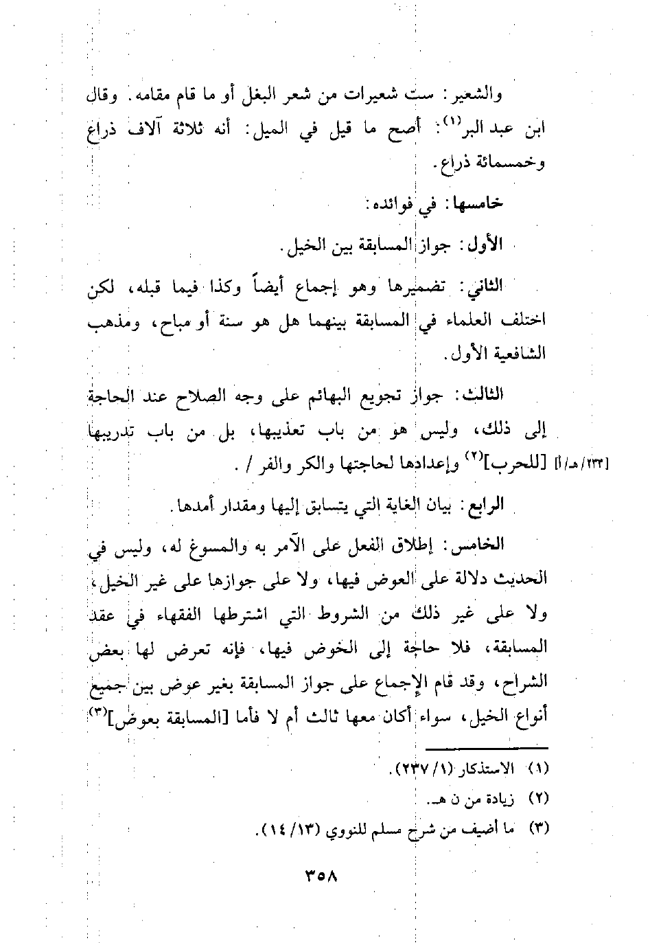 الخامس: إطلاق الفعل على الآمر به والمسوغ له، وليس في الحديث دلالة على العوض فيها, ولا على جوازها على غير الخيل، ولا على غير ذلك من الشروط التي اشترطها الفقهاء في عقد المسابقة، فلا حاجة إلى الخوض فيها، فإنه تعرض لها بعض الشراح، وقد قام الإِجماع على جواز المسابقة بغير عوض بين جميع أنواع الخيل، سواء أكان معها ثالث أم لا فأما [المسابقة بعوض] (¬3)