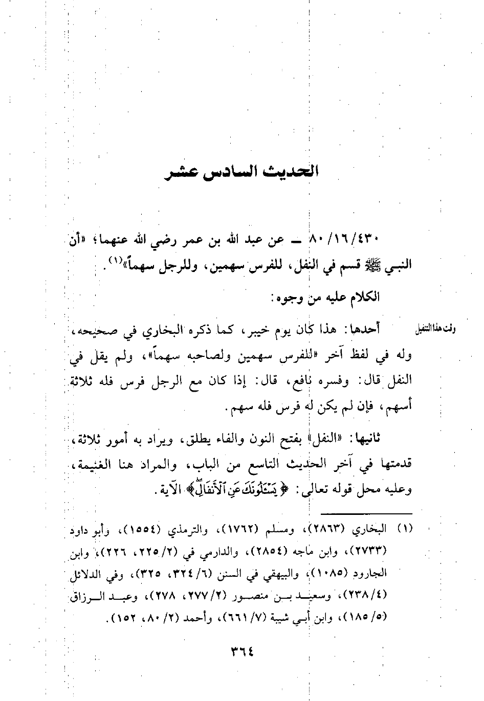 430/ 16/ 80 - عن عبد الله بن عمر رضي الله عنهما؛ "أن النبي - صلي الله عليه وسلم - قسم في النفل، للفرس سهمين، وللرجل سهمًا" (¬1).