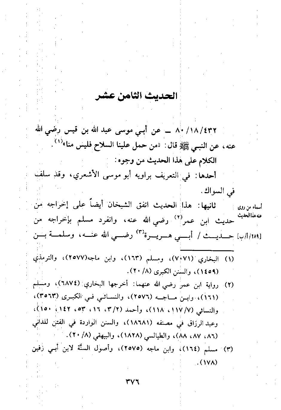 432/ 18/ 80 - عن أبي موسى عبد الله بن قيس رضي الله عنه، عن النبي - صلي الله عليه وسلم - قال: "من حمل علينا السلاح فليس منا" (¬1).