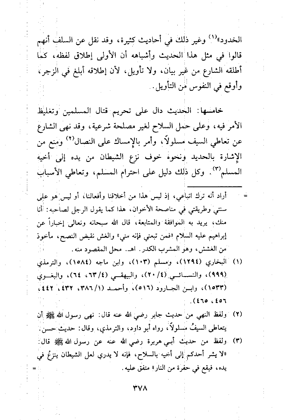 (¬3) ولفظ من حديث أبي هريرة رضي الله عنه عن رسول الله - صلي الله عليه وسلم - قال "لا يشر أحدكم إلى أخيه بالسلاح، فإنه لا يدري لعل الشيطان ينزعُ في يده، فيقع في حفرة من النار" متفق عليه. =