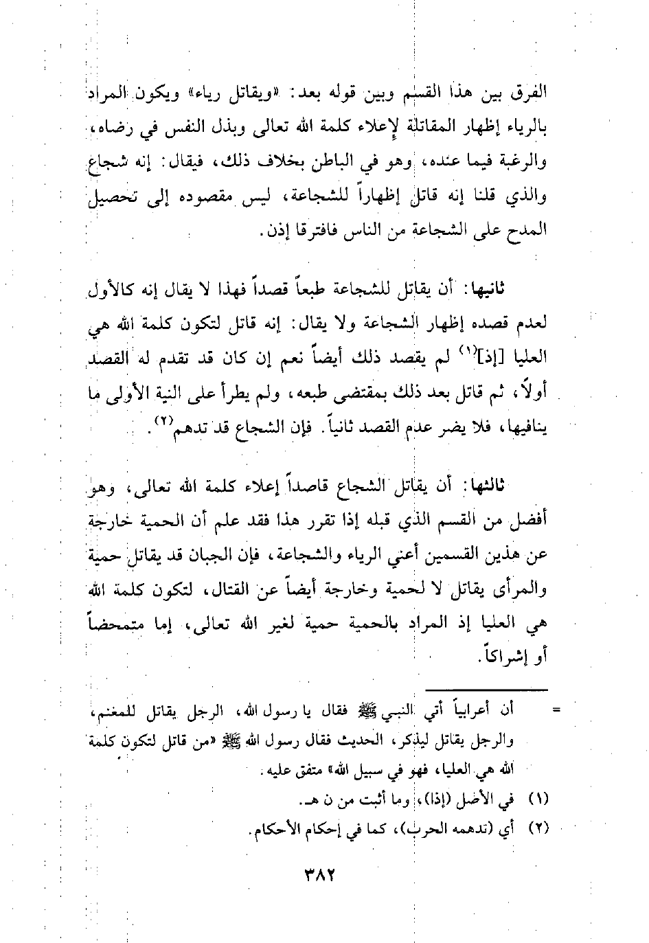ثالثها: أن يقاتل الشجاع قاصدًا إعلاء كلمة الله تعالى، وهو أفضل من القسم الذي قبله إذا تقرر هذا فقد علم أن الحمية خارجة عن هذين القسمين أعني الرياء والشجاعة، فإن الجبان قد يقاتل حمية والمرأى يقاتل لا لحمية وخارجة أيضًا عن القتال، لتكون كلمة الله هي العليا إذ المراد بالحمية حمية لغير الله تعالى، إما متمحضًا أو إشراكًا.