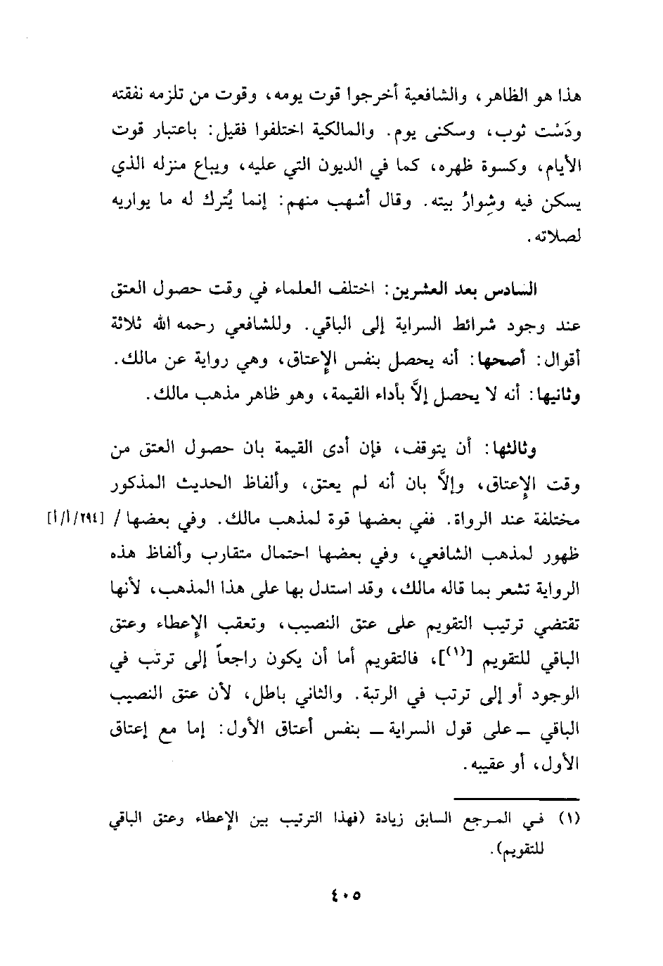 السادس بعد العشرين: اختلف العلماء في وقت حصول العتق عند وجود شرائط السراية إلى الباقي. وللشافعي رحمه الله ثلاثة أقوال: أصحها: أنه يحصل بنفس الإِعتاق، وهي رواية عن مالك. وثانيها: أنه لا يحصل إلَّا بأداء القيمة، وهو ظاهر مذهب مالك.