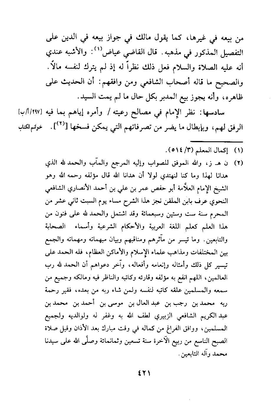 (¬2) ن هـ ز، والله الموفق للصواب وإليه المرجع والمآب والحمد لله الذي هدانا لهذا وما كنا لنهتدي لولا أن هدانا الله قال مؤلفه رحمه الله وهو الشيخ الإِمام العلاَّمة أبو حفص عمر بن علي بن أحمد الأنصاري الشافعي النحوي عرف بابن الملقن نجز هذا الشرح مساء يوم السبت ثاني عشر من المحرم سنة ست وستين وسبعمائة وقد اشتمل والحمد لله على فنون من هذا العلم كعلم اللغة العربية والأحكام الشرعية وأسماء الصحابة والتابعين. وما تيسير من مآثرهم ومناقبهم وبيان مبهماته ومهماته والجمع بين المختلفات ومذاهب علماء الإِسلام والأماكن العظام، فله الحمد على تيسير كل ذلك وأمثاله وأنعامه وأفعاله، وآخر دعواهم أن الحمد لله رب العالمين، اللهم انفع به مؤلفه وقارئه وكاتبه والناظر فيه ومالكه وجميع من سمعه والمسلمن علقه كاتبه لنفسه ولمن شاء ربه من بعده، فقير رحمة ربه محمد بن رجب بن عبد العال بن موسى بن أحمد بن محمد بن عبد الكريم الشافعي الزبيري لطف الله به وغفر له ولوالديه ولجميع المسلمين، ووافق الفراغ من كماله في وقت مبارك بعد الأذان وقبل صلاة الصبح التاسع من ربيع الآخرة سنة تسعين وثمانمائة وصلَّى الله على سيدنا محمَّد وآله التابعين.