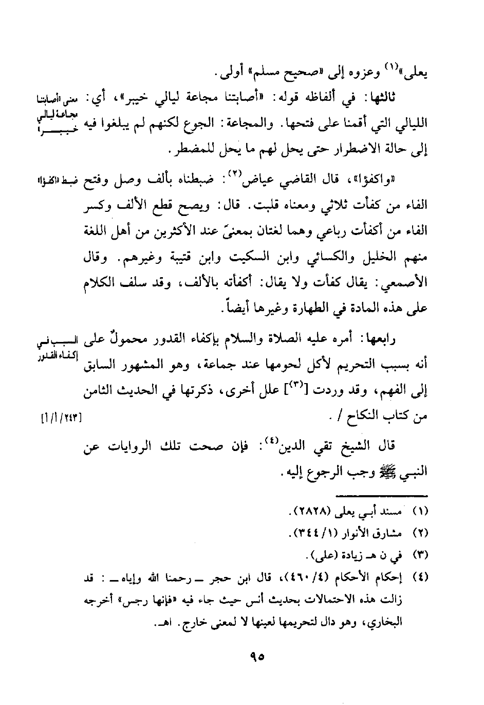 (¬4) إحكام الأحكام (4/ 460)، قال ابن حجر -رحمنا الله وإياه-: قد زالت هذه الاحتمالات بحديث إن حيث جاء فيه "فإنها رجس" أخرجه البخاري، وهو دال لتحريمها لعينها لا لمعنى خارج. اهـ.