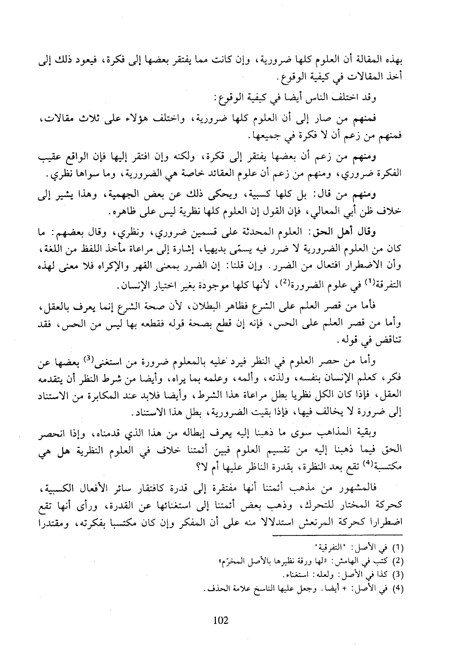 ومنهم من زعم أن بعضها يفتقر إلى فكرة، ولكنه وإن افتقر إليها فإن الواقع عقيب الفكرة ضروري، ومنهم من زعم أن علوم العقائد خاصة هي الضرورية، وما سواها نظري.