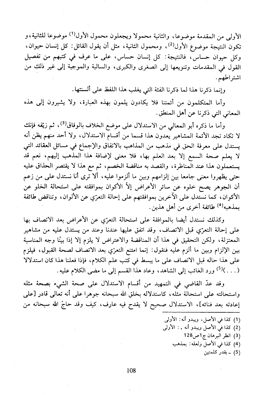 وكذلك نستدل أيضًا بالموافقة على استحالة التعري عن الأعراض بعد الاتصاف بها على إحالة التعري قبل الاتصاف، وقد اتفق عليها عندنا وعند من يستدل عليه من مشاهير المعتزلة، ولكن التحقيق في هذا أن المناقضة والاعتراض لا يلزم إلا إذا بينا وجه المناسبة بين الإلزام وبين ما ألزم عليه فنقول: إنما امتنع التعري بعد الاتصاف لصحة القبول، فيلزم على هذا حاله قبل الاتصاف على ما يبسط في كتب علم الكلام، فإذا فعلنا هذا كان استدلالا (...) ورد الغائب إلى الشاهد، وعاد هذا القسم إلى ما مضى الكلام عليه.