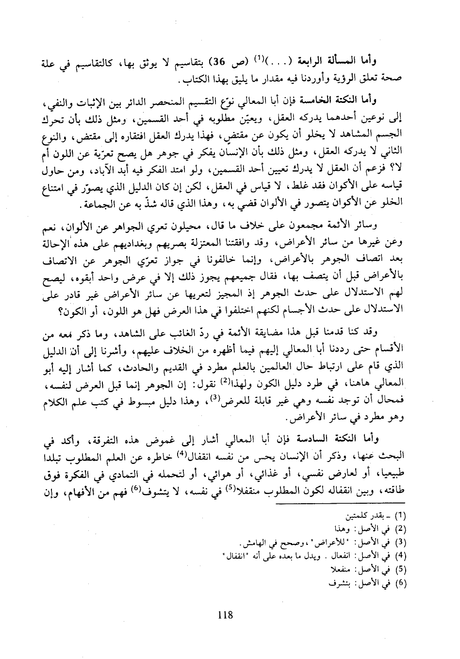 وأما المسألة الرابعة (...) (ص ٣٦) بتقاسم لا يوثق بها، كالتقاسيم في علة صحة تعلق الرؤية وأوردنا فيه مقدار ما يليق بهذا الكتاب.