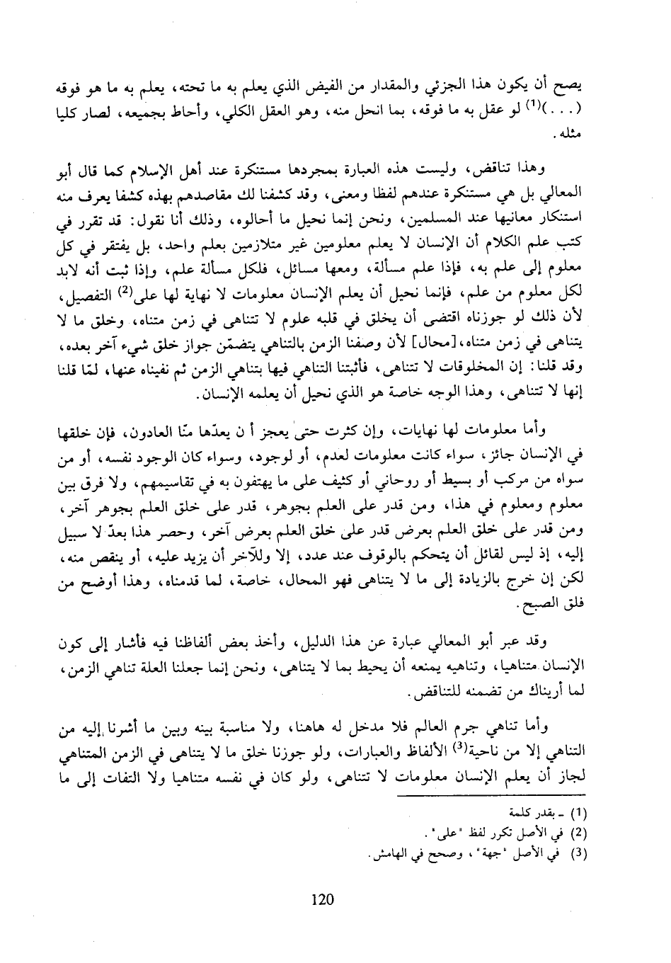 وقد عبر أبو المعالي عبارة عن هذا الدليل، وأخذ بعض ألفاظنا فيه فأشار إلى كون الإنسان متناهيًا، وتناهيه يمنعه أن يحيط بما لا يتناهى، ونحن إنما جعلنا العلة تناهي الزمن، لما أريناك من تضمنه للتناقض.