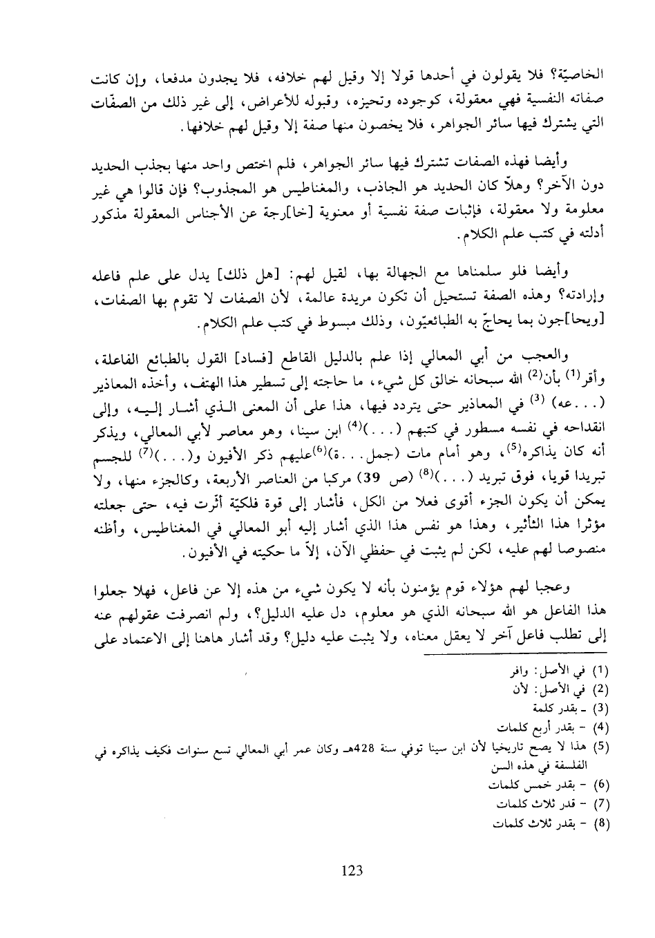 والعجب من أبي المعالي إذا علم بالدليل القاطع [فساد] القول بالطابع الفاعلة، وأقر بأن الله سبحانه خالق كل شيء، ما حاجته إلى تسطير هذا الهتف، وأخذه المعاذير (.. عه) في المعاذير حتى يتردد فيها، هذا على أن المعنى الذي أشار إليه، وإلى انقداحه في نفسه مسطور في كتبهم (...) ابن سينا، وهو معاصر لأبي المعالي، ويذكر أنه كان يذاكره، وهو أمام مات (جمل ... ة) عليهم ذكر الأفيون و (...) للجسم تبريدا قويا، فوق تبريد (...) (ص ٣٩) مركبا من العناصر الأربعة، وكالجزء منها، ولا يمكن أن يكون الجزء أقوى فعلا من الكل، فأشار إلى قوة فلكية أثرت فيه، حتى جعلته مؤثرا هذا التأثير، وهذا هو نفس هذا الذي أشار إليه أبو المعالي في المغناطيس، وأظنه منصوصا لهم عليه، لكن لم يثبت في حفظي الآن، إلا ما حكيته في الأفيون.