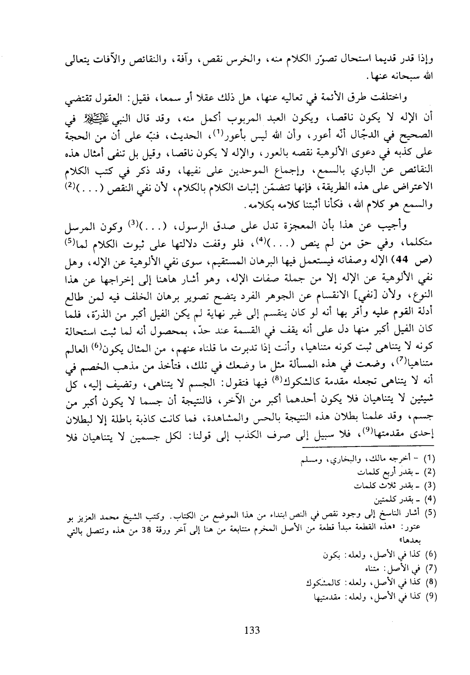 وأجيب عن هذا بأن المعجزة تدل على صدق الرسول، (...) وكون المرسل متكلما، وفي حق من لم ينص (...)، فلو وقفت دلالتها على ثبوت الكلام لام (ص ٤٤) الإله وصفاته فيستعمل فهيا البرهان المستقيم، سوى نفي الألوهية عن الإله، وهل نفي الألوهية عن الإله إلا من جملة صفات الإله، وهو أشار هاهنا إلى إخراجها عن هذا النوع، ولأن [نفي] الانقسام عن الجوهر الفرد يتضح تصوير برهان الخلف فيه لمن طالع أدلة القوم عليه وأقر بها أنه لو كان ينقسم إلى غير نهاية لم يكن الفيل أكبر من الذرة، فلما كان الفيل أكبر منها دل على أنه يقف في القسمة عند حد، بمحصول أنه لما ثبت استحالة كونه لا يتناهى ثبت كونه متناهيًا، وأنت إذا تدبرت ما قلناه عنهم، من المثال يكون العالم متناهيا، وضعت في هذه المسألة مثل ما وضعك في تلك، فتأخذ من مذهب الخصم في أنه لا يتناهى تجعله مقدمة كالشكوك فيها فتقول: الجسم لا يتناهى، وتضيف إليه، كل شيئين لا يتناهيان فلا يكون أحدهما أكبر من الآخر، فالنتيجة أن جسما لا يكون أكبر من جسم، وقد علمنا بطلان هذه النتيجة بالحس والمشاهدة، فما كانت كاذبة باطلة إلا لبطلان إحدى مقدمتها، فلا سبيل إلى صرف الكذب إلى قولنا: لكل جسمين لا يتناهيان فلا