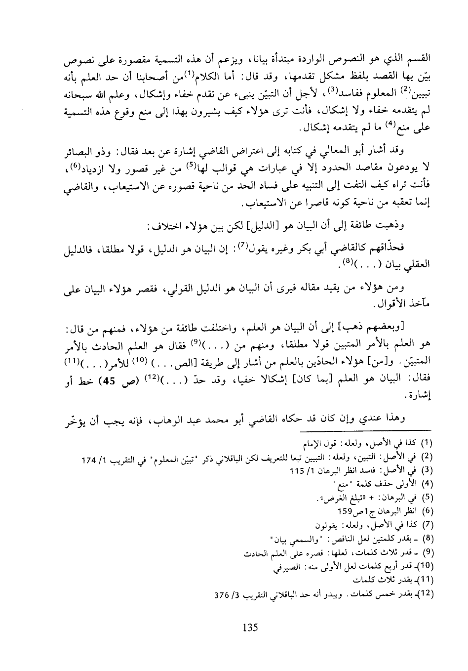 القسم الذي هو النصوص الواردة مبتدأة بيانا، ويزعم أن هذه التسمية مقصورة على نصوص بين بها القصد بلفظ مشكل تقدمها، وقد قال: أما الكلام من أصحابنا أن حد العلم بأنه تبيين المعلوم ففاسد، لأجل أن التبيين ينبئ عن تقدم خفاء وإشكال، وعلم الله سبحانه لم يتقدمه خفاء ولا إشكال، فأنت ترى هؤلاء كيف يشيرون بهذا إلى منع وقوع هذه التسمية على منع ما لم يتقدمه إشكال.