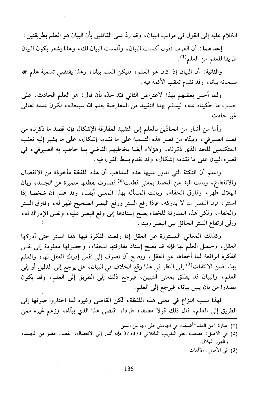 وأما من أشار من الحادين بالعلم إلى التقييد لمفارقة الإشكال فإنه قصد ما ذكرناه من قصد الصيرفي، وبيناه من قصر هذه التسمية على ما تقدمه إشكال، على ما يشير إليه تعقب المتكلمين للحد الذي ذكرناه، وهؤلاء أيضًا يخاطبهم القاضي بما خاطب به الصيرفي، في قصره البيان على ما تقدمه إشكال، وقد تقدم بسط القول فيه.
