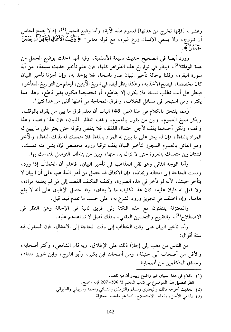 وورد أيضًا في الصحيح حديث سبيعة الأسلمية، وفيها أنها "حلت بوضع الحمل من عدة الوفاة"، فينظر في تواريه هذه الظواهر كلها، فإن علم تأخير حديث سبيعة، عن آية سورة البقرة، وقلنا بإحالة تأخير البيان صار ناسخًا، فلا يؤخذ به، وإن أجزنا تأخير البيان كان مخصصا، فيصح الأخذ به، وهكذا ينظر أيضًا في تاريخ الآيتين، ليعلم من التواريخ المتأخر، فينظر هل أنت تطلب نسخًا فلا يكون إلا بقاطع، أو تخصيصا فيكون بغير قاطع، وهذا مما يكثر، ومن استبحر في مسائل الخلاف، وطرق المحاجة من أهلها ألفي من هذا كثير.