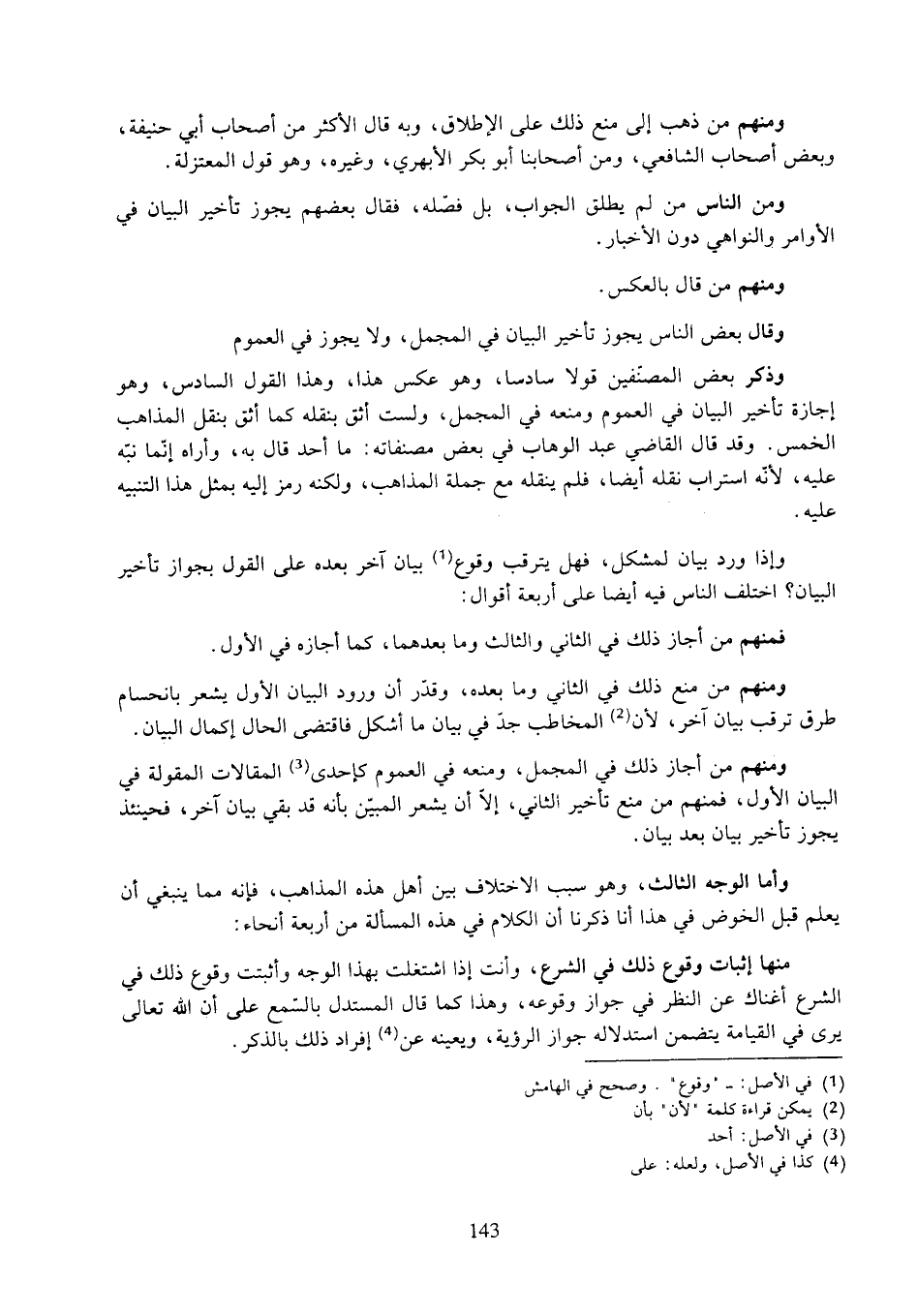 ومنهم من أجاز ذلك في المجمل، ومنعه في العموم كإحدى المقالات المقولة في البيان الأول، فمنهم من منع تأخير الثاني، إلا أن يشعر المبين بأنه قد بقي بيان آخر، فحينئذ يجوز تأخير بيان بعد بيان.