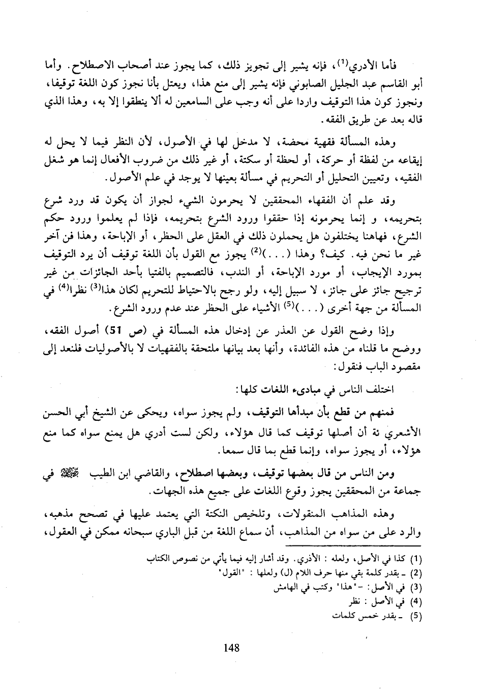 فأما الأدري، فإنه يشير إلى تجويز ذلك، كما يجوز عند أصحاب الاصطلاح. وأما أبو القاسم عبد الجليل الصابوني فإنه يشير إلى منع هذا، ويعتل بأنا نجوز كون اللغة توقيفا، ونجوز كون هذا التوقيف واردا على أنه وجب على السامعين له ألا ينطقوا إلا به، وهذا الذي قاله بعد عن طريق الفقه.