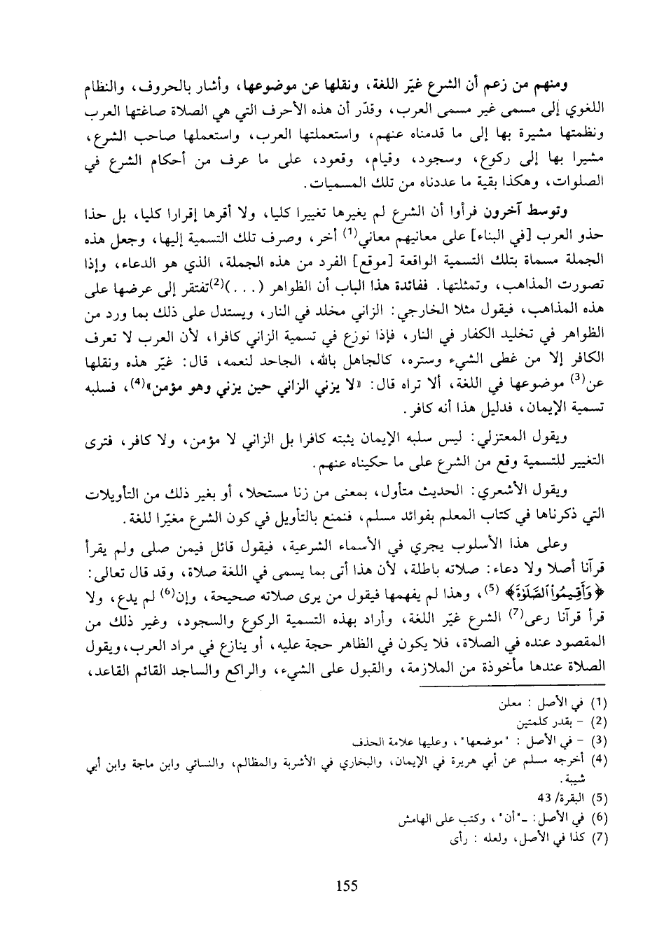 وتوسط آخرون فرأوا أن الشرع لم يغيرها تغييرا كليًا، ولا أقرها إقرارا كليا، بل حذا حذو العرب [في البناء] على معانيهم معاني أخر، وصرف تلك التسمية إليها، وجعل هذه الجملة مسماة بتلك التسمية الواقعة [موقع] الفرد من هذه الجملة، الذي هو الدعاء، وإذا تصورت المذاهب، وتمثلتها. ففائدة هذا الباب أن الظواهر (...) تفتقر إلى عرضها على هذه المذاهب، فيقول مثلا الخارجي: الزاني مخلد في النار، ويستدل على ذلك بما ورد من الظواهر في تخليد الكفار في النار، فإذا نوزع في تسمية الزاني كافرا، لأن العرب لا تعرف الكافر إلا من غطى الشيء وستره، كالجاهل بالله، الجاحد لنعمه، قال: غير هذه ونقلها عن موضوعها في اللغة، ألا تراه قال: "لا يزني الزاني حين يزني وهو مؤمن"، فسلبه تسمية الإيمان، فدليل هذا أنه كافر.
