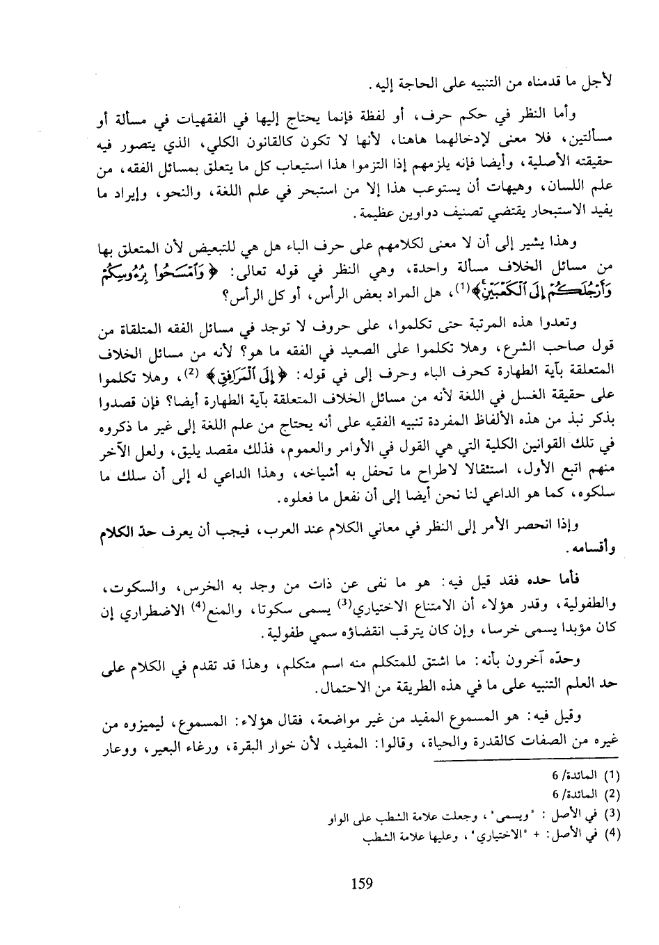 وتعدوا هذه المرتبة حتى تكلموا، على حروف لا توجد في مسائل الفقه المتلقاة من قول صاحب الشرع، وهلا تكلموا على الصعيد في الفقه ما هو؟ لأنه من مسائل الخلاف المتعلقة بآية الطهارة كحرف الباء وحرف إلى في قولله: (إلى المرافق)، وهلا تكلموا على حقيقة الغسل في اللغة لأنه من مسائل الخلاف المتعلقة بآية الطهارة أيضا؟ فإن قصدوا بذكر نبذ من هذه الألفاظ المفردة تنبيه الفقيه على أنه يحتاج من علم اللغة إلى غير ما ذكروه في تلك القوانين الكلية التي هي القول في الأوامر والعموم، فذلك مقصد يليق، ولعل الآخر منهم اتبع الأول، استقالا لاطراح ما تحفل به أشياخه، وهذا الداعي له إلى أن سلك ما سلكوه، كما هو الداعي لنا نحن أيضًا إلى أن نفعل ما فعلوه.