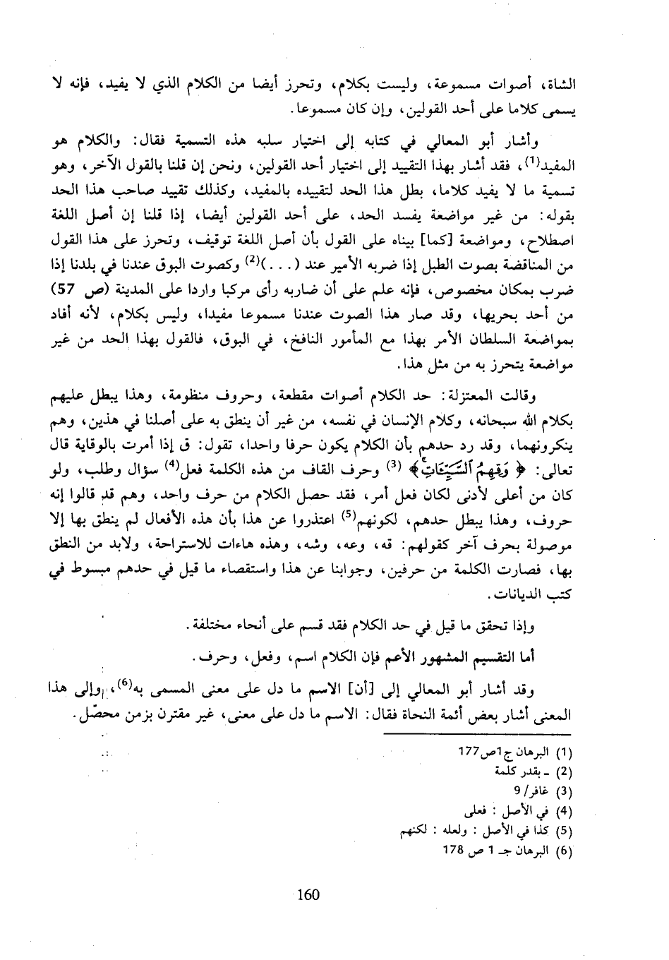 وأشار أبو المعالي في كتابه إلى اختيار سلبه هذه التسمية فقال: والكلام هو المفيد، فقد أشار بهذا التقييد إلى اختيار أحد القولين، ونحن إن قلنا بالقول الآخر، وهو تسمية ما لا يفيد كلاما، بطل هذا الحد لتقييده بالمفيد، وكذلك تقييد صاحب هذا الحد بقوله: من غير مواضعة يفسد الحد، على أحد القولين أيضا، إذا قلنا إن أصل اللغة اصطلاح، ومواضعه [كما] بيناه على القول بأن أصل اللغة توقيف، وتحرز على هذا القول من المناقضة بصوت الطبل إذا ضربه الأمير عند (...) وكصوت البوق عندنا في بلدنا إذا ضرب بمكان مخصوص، فإنه علم على أن ضاربه رأى مركبا واردا على المدينة (ص ٥٧) من أحد بحريها، وقد صار هذا الصوت عندنا مسموعا مفيدا، وليس بكلام، لأنه أفاد بمواضعة السلطان الأمر بهذا مع المأمور النافخ، في البوق، فالقول بهذا الحد من غير مواضعة يتحرز به من مثل هذا.