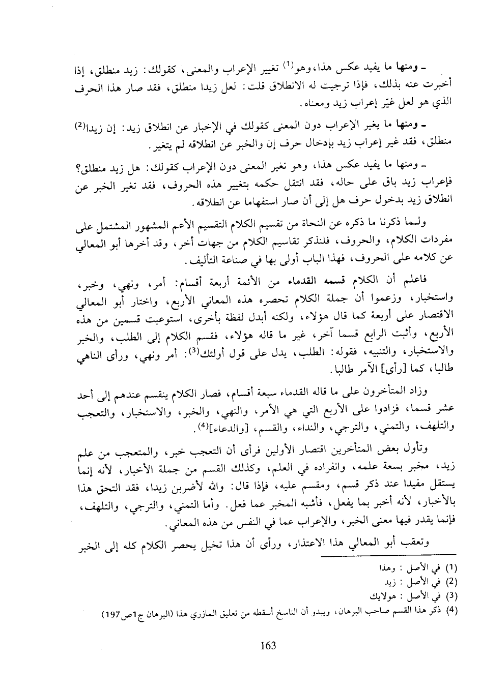 فاعلم أن الكلام قسمه القدماء من الأئمة أربعة أقسام: أمر، ونهي، وخبر، واستخبار، وزعموا أن جملة الكلام تحصره هذه المعاني الأربع، واختار أبو المعالي الاقتصار على أربعة كما قال هؤلاء، ولكنه أبدل لفظة بأخرى، استوعبت قسمين من هذه الأربع، وأثبت الرابع قسما آخر، غير ما قاله هؤلاء، فقسم الكلام إلى الطلب، والخبر والاستخبار, والتنبيه، فقوله: الطلب، يدل على قول أولئك: أمر ونهي، ورأى الناهي طالبا، كما [رأى] الآمر طلبا.