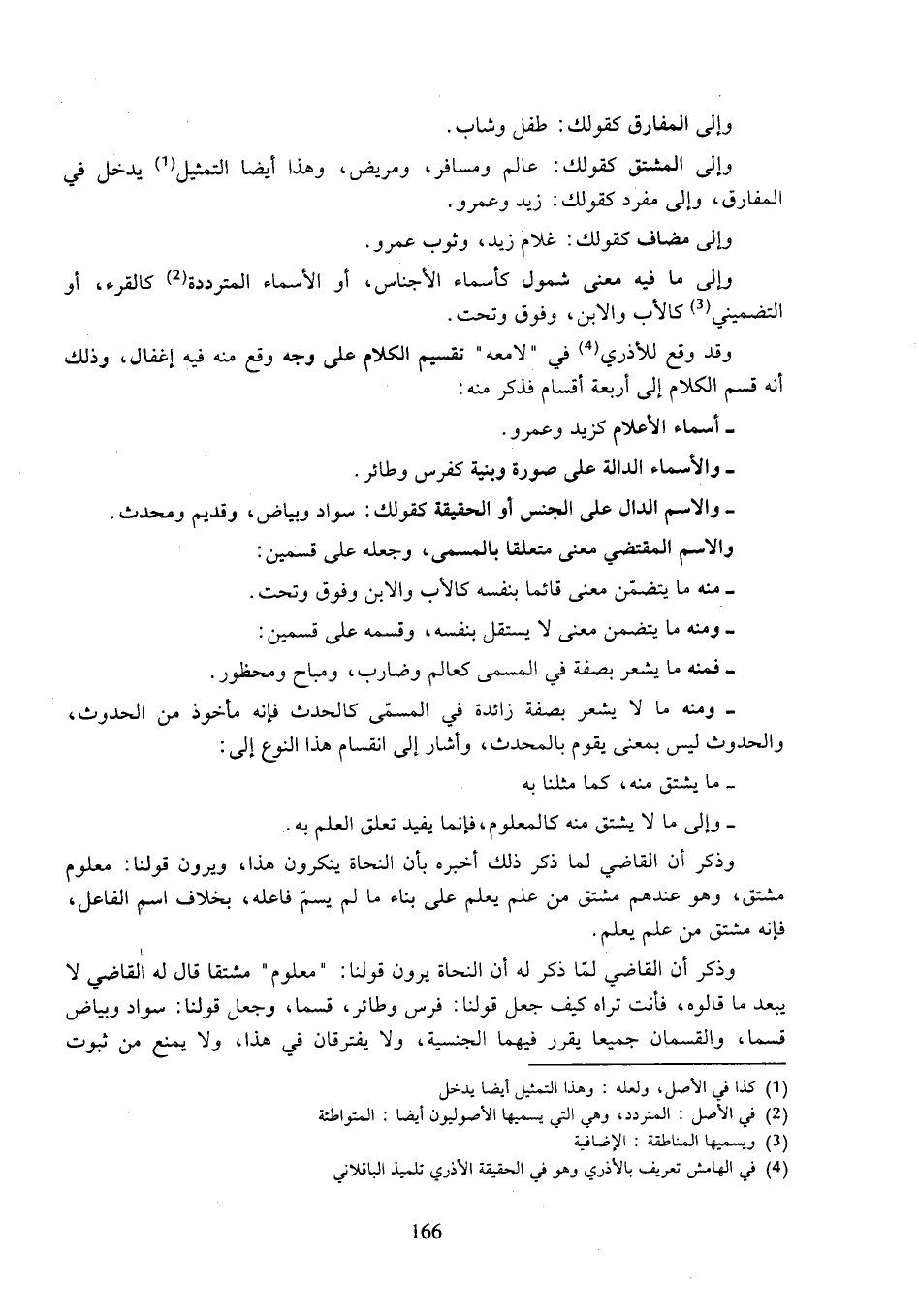 وذكر أن القاضي لما ذكر له أن النحاة يرون قولنا: "معلوم" مشتقا قال له القاضي لا يبعد ما قالوه، فأنت تراه كيف جعل قولنا: فرس وطائر، قسما، وجعل قولنا: سواد وبياض قسما، والقسمان جميعا يقرر فيهما الجنسية، ولا يفترقان في هذا، ولا يمنع من ثبوت