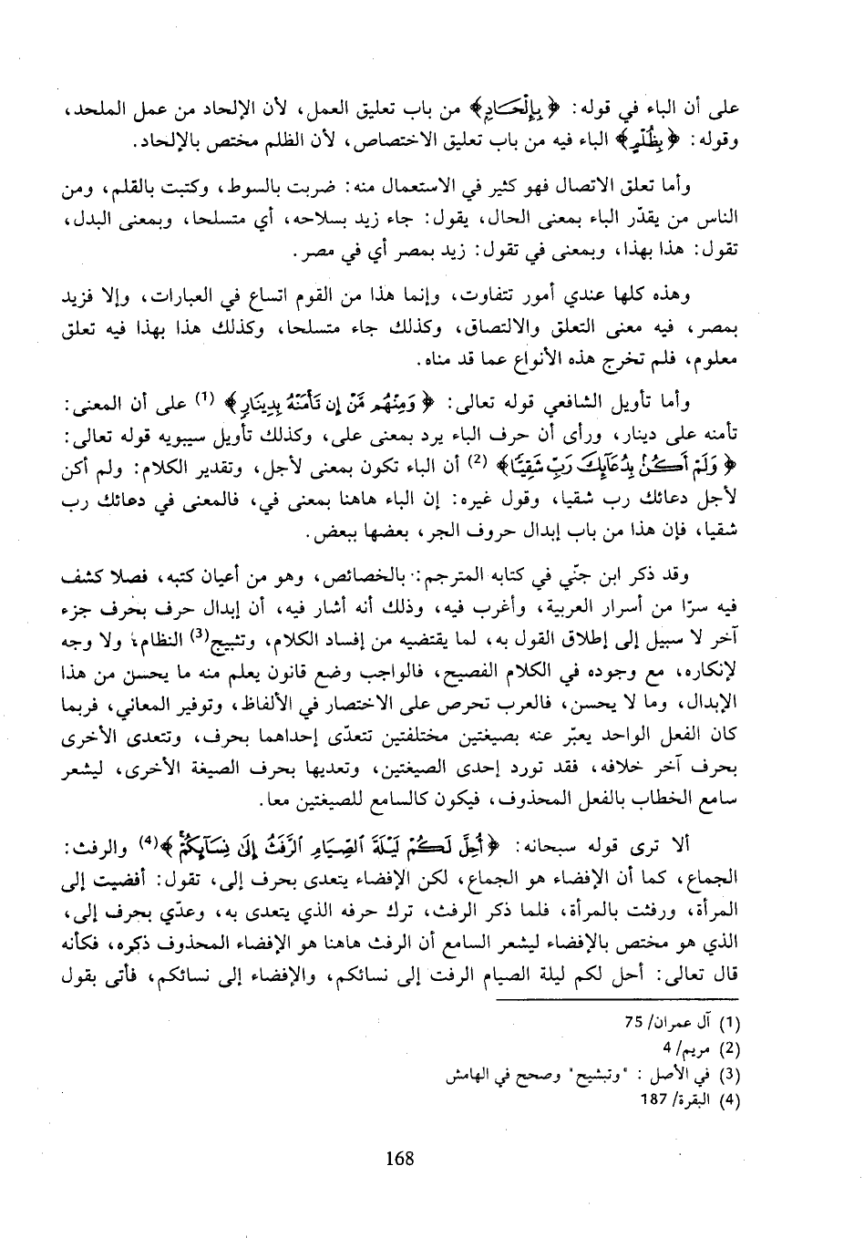 وقد ذكر ابن جني في كتابه المترجم: بالخصائص، وهو من أعيان كتبه، فصلا كشف فيه سرا من أسرار العربية، وأغرب فيه، وذلك أنه أشار فيه، أن إبدال حرف بحرف جزء آخر لا سبيل إلى إطلاق القول به، لما يقتضيه من إفساد الكلام، وتثبيج النظام، ولا وه لإنكاره، مع وجوده في الكلام الفصيح، فالواجب وضع قانون يعلم منه ما يحسن من هذا الإبدال، وما لا يحسن، فالعرب تحرص على الاختصار في الألفاظ، وتوفير المعاني، فربما كان الفعل الواحد يعبر عنه بصيغتي مختلفتين تتعدى إحداهما بحرف، وتتعدى الأخرى بحرف آخر خلافه، فقد تورد إحدى الصيغتين، وتعديها بحرف الصيغة الأخرى، ليشعر سامع الخطاب بالفعل المحذوف، فيكون كالسامع للصيغتين معا.