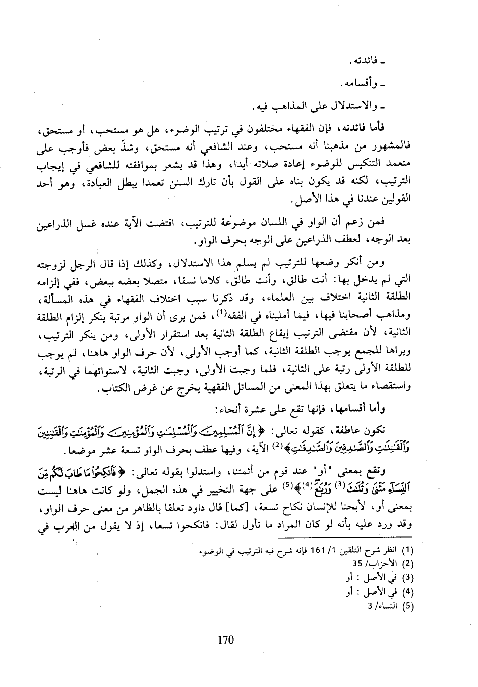فمن زعم أن الواو في اللسان موضوعة للترتيب، اقتضت الآية عنده غسل الذراعين بعدا لوجه، لعطف الذراعين على الوجه بحرف الواو.