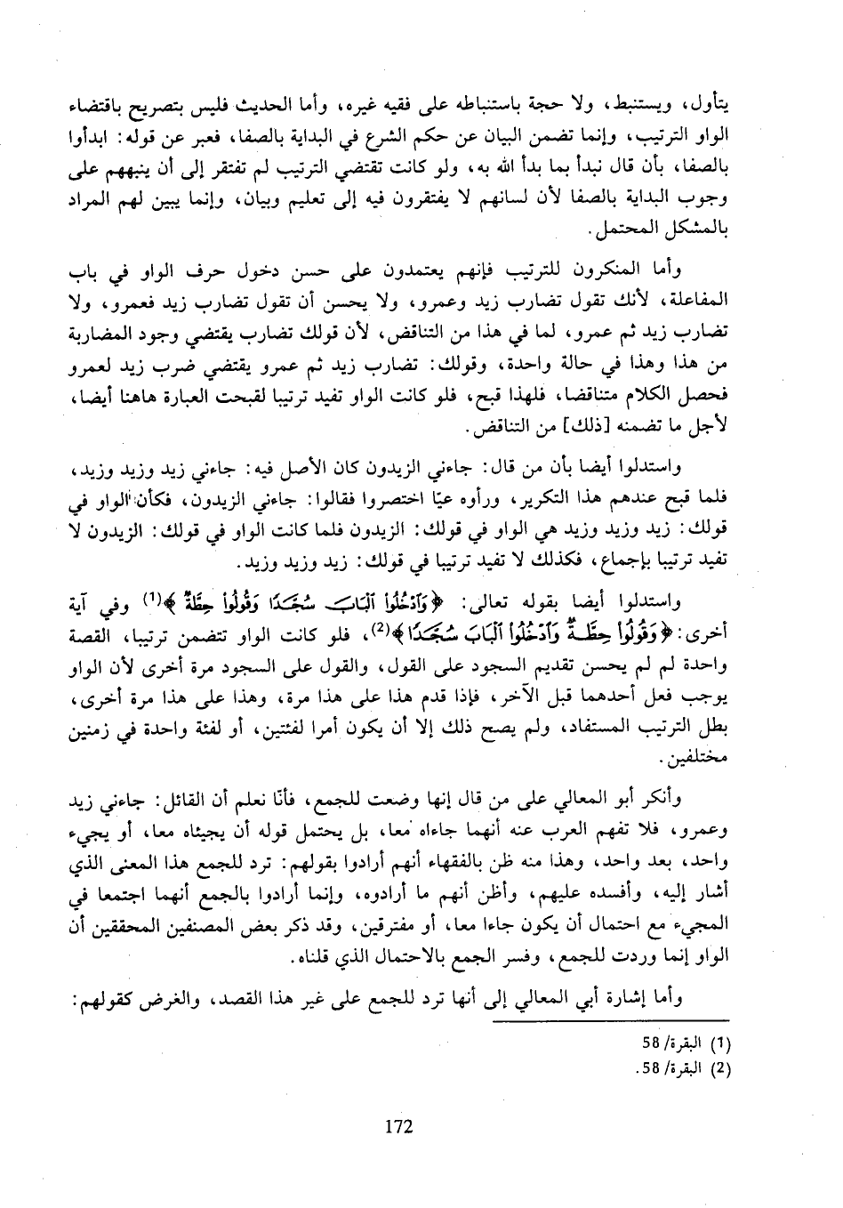 وأما المنكرون للترتيب فإنهم يعتمدون على حسن دخول حرف الواو في باب المفاعلة، لأنك تقول تضارب زيد وعمرو، ولا يحسن أن تقول تضارب زيد فعمرو، ولا تضارب زيد ثم عمرو، لما في هذا من التناقض، لأن قولك تضارب يقتضي وجود المضاربة من هذا وهذا في حالة واحدة، وقولك: تضارب زيد ثم عمرو يقتضي ضرب زيد لعمرو فحصل الكلام متناقضا، فلهذا قبح، فلو كانت الواو تفيد ترتيبا لقبحت العبارة هاهنا أيضا، لأجل ما تضمنه [ذلك] من التناقض.
