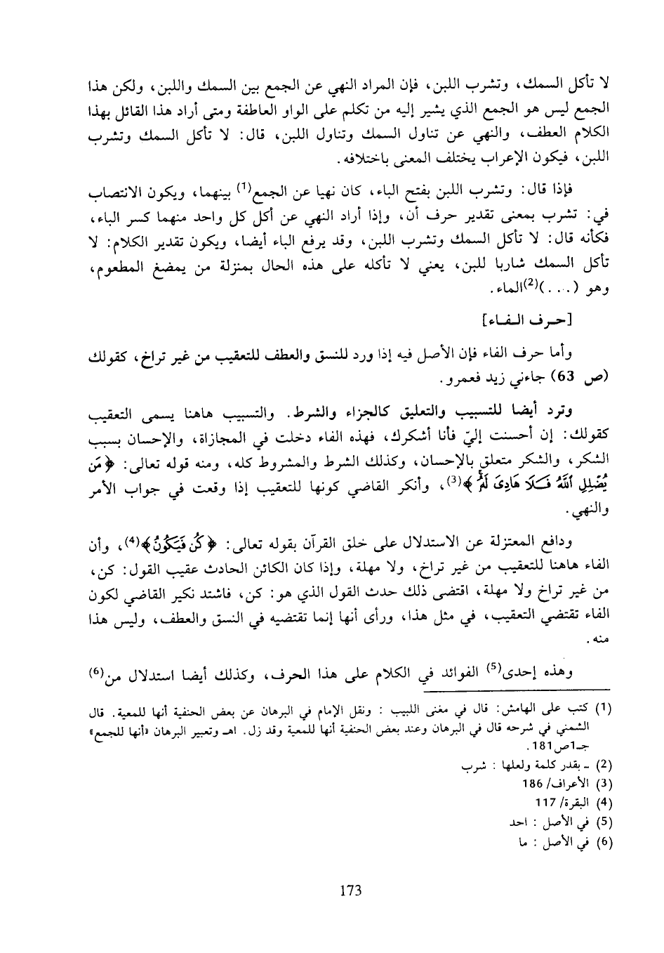 فإذا قال: وتشرب اللبن بفتح الباء، كان نهيا عن الجمع بينهما، ويكون الانتصاب في: تشرب بمعنى تقدير حرف أن، وإذا أراد النهي عن أكل كل واحد منهما كسر الباء، فكأنه قال: لا تأكل اسمك وتشرب اللبن، وقد يرفع الباء أيضا، ويكون تقدير الكلام: لا تأكل السمك شاربا للبن، يعني لا تأكله على هذه الحالة بمنزلة من يمضغ المطعوم، هوه (...) الماء.