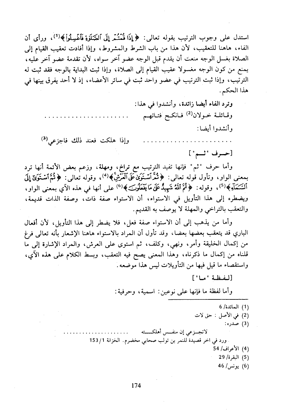 وأما حرف "ثم" فإنها تفيد الترتيب مع تراخ، ومهلة، وزعم بعض الأئمة أنها ترد بمعنى الواو، وتأول قوله تعالى: (ثم استوى على العرش)،وقوله تعالى: (ثم استوى إلى السماء)، وقوله: (ثم الله شهيد على ما يفعلون) على أنها في هذه الآي بمعنى الواو، ويضطره إلى هذا التأويل في الاستواء، أن الاستواء صفة ذات، وصفة الذات قديمة، والتعقب بالتراخي والمهلة لا يوصف به القديم.