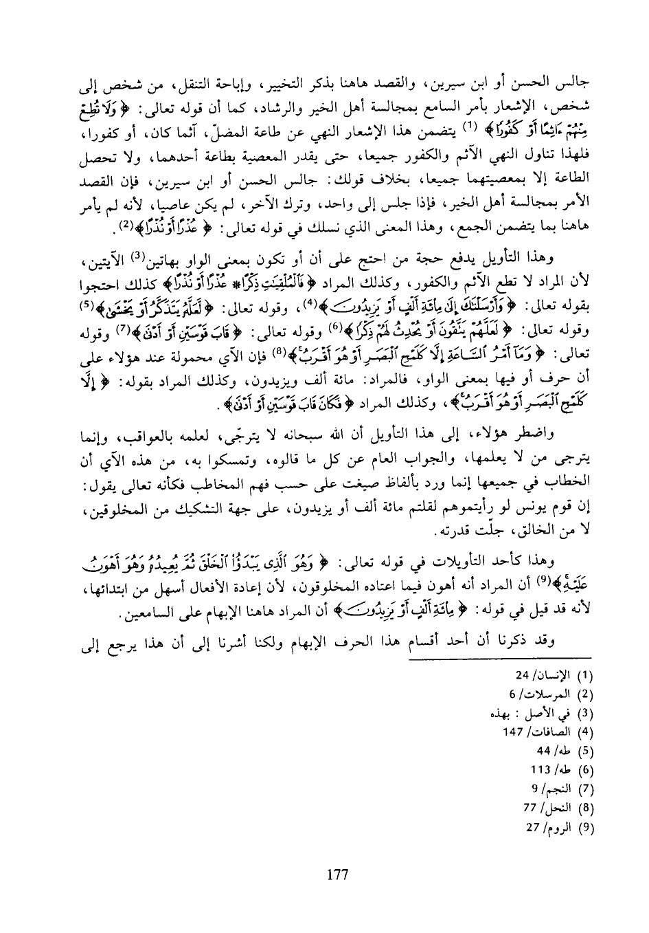 وهذا التأويل يدفع حجة من احتج على أن أو تكون بمعنى الواو بهاتين الآيتين، لأن المراد لا تطع الآثم والكفور، وكذلك المراد (فالملقيات ذكرا* عذرا أو نذرا) كذلك احتجوا بقوله تعالى: (وأرسلناك إلى مائة ألف أو يزيدون)، وقوله تعالى: (لعلة يتذكر أو يخشى) وقوله تعالى: (لعلهم يتقون أو يحدث لهم ذكرا) وقوله تعالى: (قاب قوسين أو أدنى) وقوله تعالى: (وما أمر الساعة إلا كلمح البصر أو هو أقرب) إن الآي محمولة عند هؤلاء على أن حرف أو يها بمعنى الواو، فالمراد: مائة ألف ويزيدون، وكذلك المراد بقوله: (إلا كلمح البصر أو هو أقرب)، وكذلك المراد (فكان قاب قوسين أو أدنى).