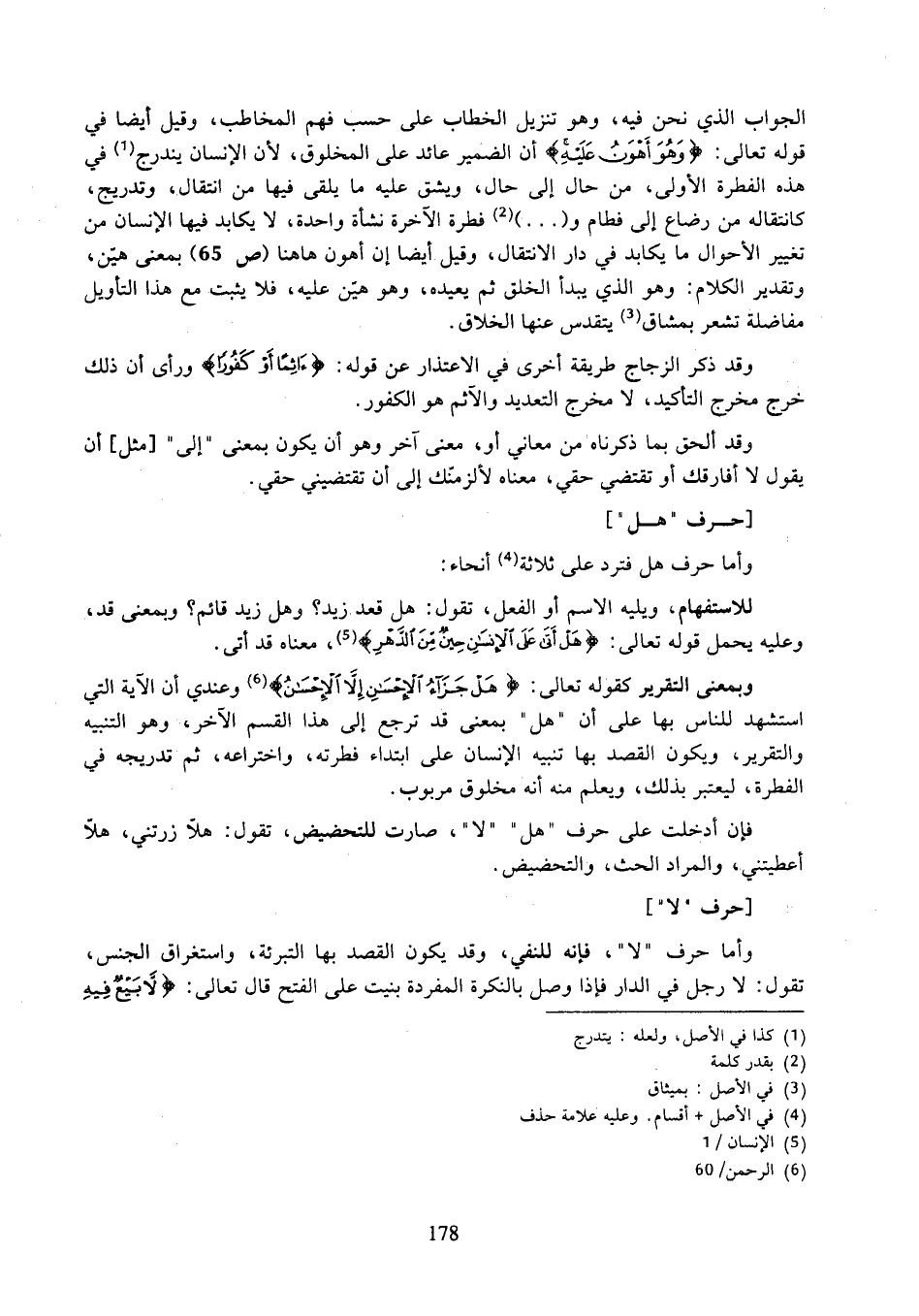 وبمعنى التقرير كقوله تعالى: (هل جزاء الإحسان إلا الإحسان) وعندي أن الآية التي استشهد للناس بها على أن "هل" بمعنى قد ترجع إلى هذا القسم الآخر، وهو التنبيه والتقرير، ويكون القصد بها تنبيه الإنسان على ابتداء فطرته، واختراعه، ثم تدريجه في الفطرة، ليعتبر بذلك، ويعلم منه أنه مخلوق مربوب.