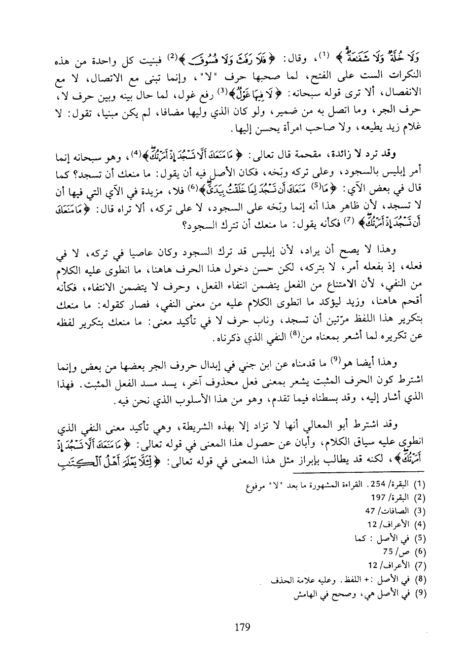 وهذا لا يصح أن يراد، لأن إبليس قد ترك السجود وكان عاصيا في تركه، لا في فعله، إذ بفعله أمر، لا بتركه، لكن حسن دخول هذا الحرف هاهنا، ما انطوى عليه الكلام من النفي، لأن الامتناع من الفعل يتضمن انتفاء الفعل، وحرف لا يتضمن الانتفاء، فكأنه أقحم هاهنا، وزيد ليؤكد ما انطوى الكلام عليه من معنى النفي، فصار كقوله: ما منعك بتكرير هذا اللفظ مرتين أن تسد، وناب حرف لا في تأكيد معنى: ما منعك بتكرير لفظه عن تكريره لما أشعر بمعناه من النفي الذي ذكرناه