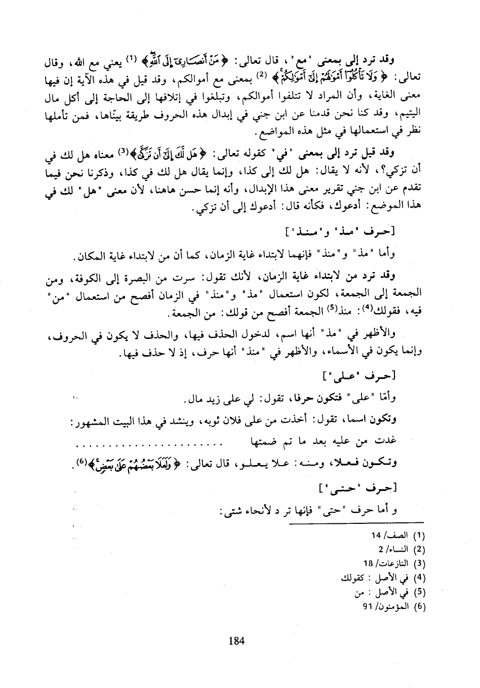 وقد ترد إلى بمعنى "مع"، قال تعالى: (من أنصاري إلى الله) يعني مع الله، وقال تعالى: (ولا تأكلوا أموالهم إلى أموالكم) بمعنى مع أموالكم، وقد قيل في هذه الآية إن فيها معنى الغاية، وأن المراد لا تتلفوا أموالكم، وتبلغوا في إتلافها إلى الحاجة إلى أكل مال اليتيم، وقد كنا نحن قدمنا عن ابن جني في إبدال هذه الحروف طريقة بيناها، فمن تأملها نظر في استعمالها في مثل هذه المواضع.