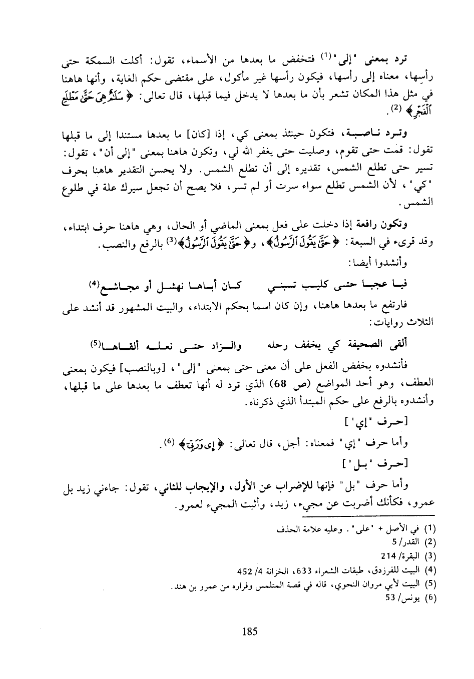 وترد ناصبة، فتكون حينئذ بمعنى كي، إذا [كان] ما بعدها مستندا إلى ما قبلها تقول: قمت حتى تقوم، وصليت حتى يغفر الله لي، وتكون هاهنا بمعنى "إلى أن"، تقول: تسير حتى تطلع الشمس، تقديره إلى أن تطلع الشمس. ولا يحسن التقدير هاهنا بحرف "كي"، لأن الشمس تطلع سواء سرت أو لم تسر، فلا يصح أن تجعل سيرك علة في طلوع الشمس.
