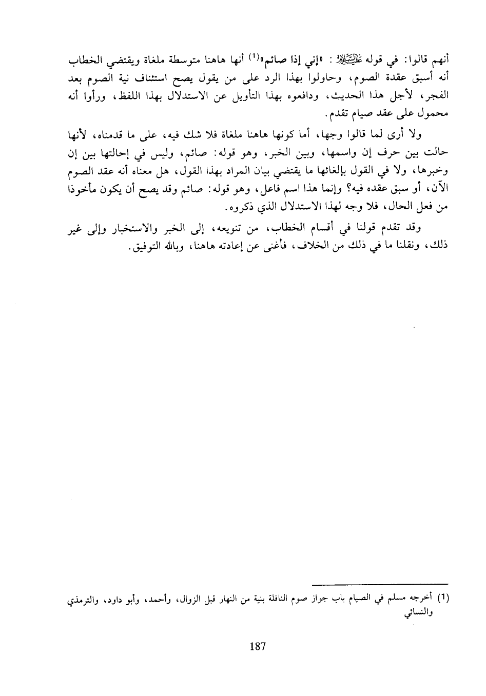 أنهم قالوا: في قوله عليه السلام: "إني إذا صائم" أنها هاهنا متوسطة ملغاة ويقتضي الخطاب أنه أسبق عقدة الصوم، وحاولوا بهذا الرد على من يقول يصح استئناف نية الصوم بعد الفجر، لأجل هذا الحديث، ودافعوه بهذا التأويل عن الاستدلال بهذا اللفظ، ورأوا أنه محمول على عقد صيام تقدم.