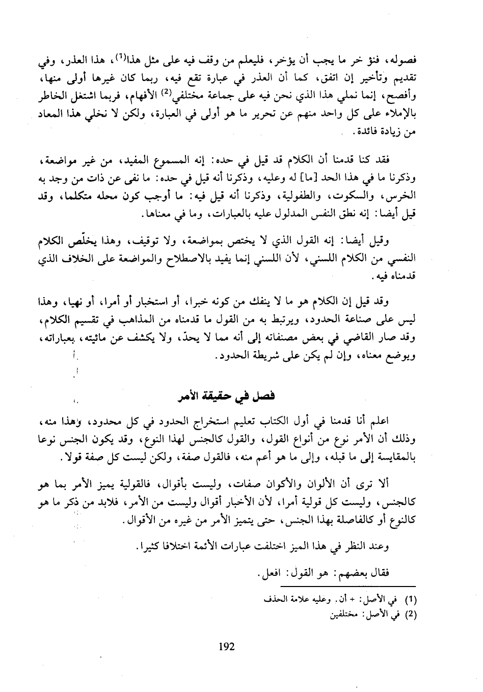 اعلم أنا قدمنا في أول الكتاب تعليم استخراج الحدود في كل محدود، وهذا منه، وذلك أن الأمر نوع من أنواع القول، والقول كالجنس لهذا النوع، وقد يكون الجنس نوعا بالمقايسة إلى ما قبله، وإلى ما هو أعم منه، فالقول صفة، ولكن ليست كل صفة قولا.
