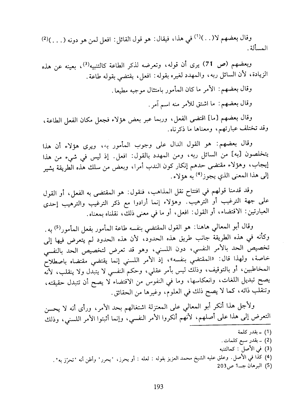 ولأجل هذا أنكر أبو المعالي على المعتزلة اشتغالهم بحد الأمر، ورأى أنه لا يحسن التعرض إلى هذا على أصلهم، لأنهم أنكروا الأمر النفسي، وإنما أثبتوا الأمر اللسني، وذلك