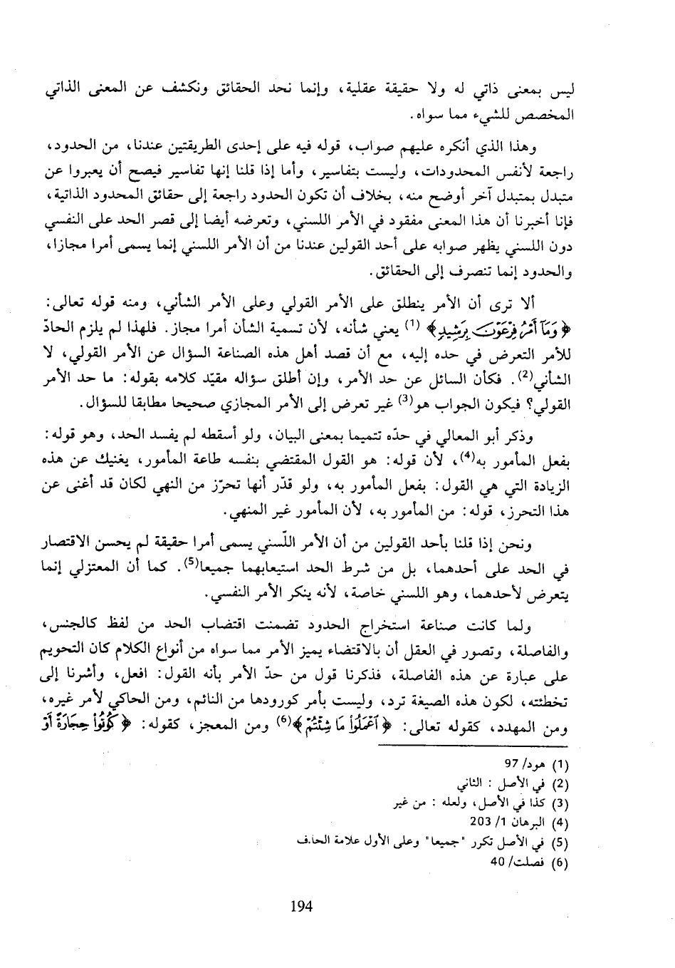 وهذا الذي أنكره عليهم صواب، قوله فيه على إحدى الطريقتين عندنا، من الحدود، راجعة لأنفس المحدودات، وليست بتفاسير، وأما إذا قلنا إنها تفاسير فيصح أن يعبروا عن متبدل بمتبدل آخر أوضح منه، بخلاف أن تكون الحدود راجعة إلى حقائق المحدود الذاتية، فإنا أخبرنا أن هذا المعنى مفقود في الأمر اللسني، وتعرضه أيضا إلى قصر الحد على النفسي دون اللسني يظهر صوابه على أحد القولين عندنا من أن الأمر اللسني إنما يسمى أمرا مجازا، والحدود إنما تنصرف إلى الحقائق.