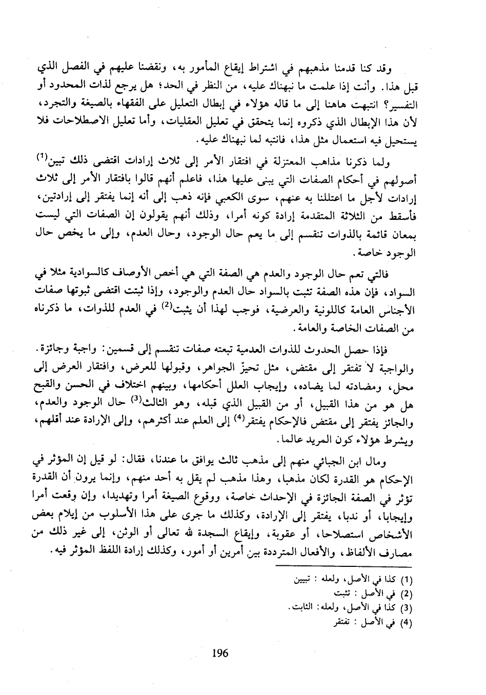 ولما ذكرنا مذاهب المعتزلة في افتقار الأمر إلى ثلاث إرادات اقتضى ذلك تبين أصولهم في أحكام الصفات التي يبني عليها هذا، فاعلم أنهم قالوا بافتقار الأمر إلى ثلاث إرادات لأجل ما اعتللنا به عنهم، سوى الكعبي فإنه ذهب إلى أنه إنما يفتقر إلى إرادتين، فأسقط من الثلاثة المتقدمة إرادة كونه أمرا، وذلك أنهم يقولون إن الصفات التي ليست بمعان قائمة بالذوات تنقسم إلى ما يعم حال الوجود، وحال العدم، وإلى ما يخص حال الوجود خاصة.