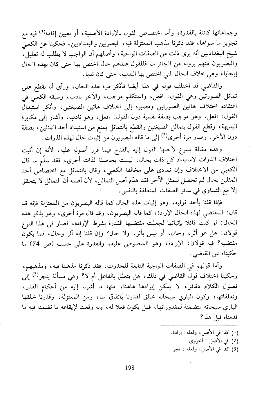 فإذا قلنا بأحد قوليه، وهو إثبات هذه الحال كما قاله البصريون من المعتزلة فإنه قد قال: المقتضي لهذه الحالة الإرادة، كما قاله البصريون، وقد قال مرة أخرى، وهو يذكر هذه الحال: لو كنت قائلا بإثباتها لجعلت مقتضيها القدرة بشرط الإرادة، فصار في هذا النوع قولان: هل هو أثر، وحال، أو ليس بأثر، ولا حال؟ وإن قلنا إنه أثر وحال، فما يكون مقتضيه؟ فيه قولان: الإرادة، وهو المنصوص عليه، والقدرة على حسب (ص ٧٤) ما حكيناه عن القاضي.