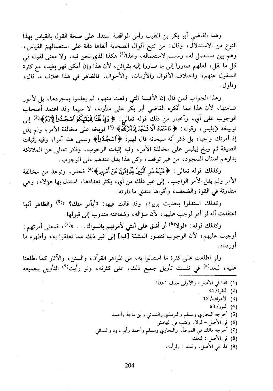 وهذا الجواب لمن قال إن الأقيسة التي وقعت منهم، لم يعلموا بمجردها، بل لأمور ضامتها، لأن هذا مما أنكره القاضي أبو بكر على متأوله، لا سيما وقد اعتمد أصحاب الوجوب على آي، وأخبار من ذلك قوله تعالى: (وإذ قلنا للملائكة اسجدوا لأدم) إلى توبيخه لإبليس، وقوله: (ما منعك ألا تسجد إذ أمرتك) فوبخه على مخالفة الأمر، ولم يقل إذ أمرتك واجبا، بل ذكر أنه سبحانه قال لهم: (اسجدوا) وسمى هذا أمرا، وفيه إثبات الصيغة ثم وبخ إبليس على مخالفة الأمر، وفيه إثبات الوجوب، وذكر تعالى عن الملائكة بدارهم امتثال السجود، من غير توقف، وكل هذا يدل عندهم على الوجوب.