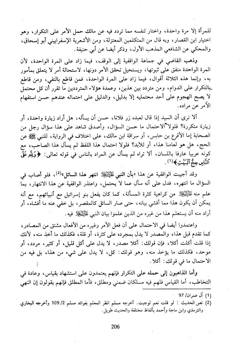 الا ترى أن السيد إذا قال لعبده زر فلانا، حسن أن يسأله هل أراد زيارة واحدة، أو زيارة متكررة؟ فلولا الاحتمال ما حسن السؤال، وأصدق شاهد على هذا سؤال رجل من الصحابة إما الأقرع بن حابس، أو سراقة ابن مالك، على اختلاف في الرواية، للنبي صلى الله عليه وسلم عن الحج، هل هو لعامنا هذا، أو للأبد؟ فلولا احتمال هذا اللفظ لم يسال هذا الصاحب، مع كونه عربيا عارفا باللسان، ألا تراه لم يسال عن المراد بالناس في قوله تعالى: (ولله على الناس حج البيت).